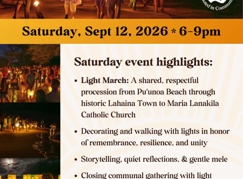 On Saturday, September 12, from 6:00–9:00 pm, the Light March offers a walk of remembrance, resilience, and unity through historic Lahaina Town, as participants carry light together with gentle mele, quiet reflection, and storytelling woven along the route, concluding with a closing gathering at Maria Lanakila Catholic Church.