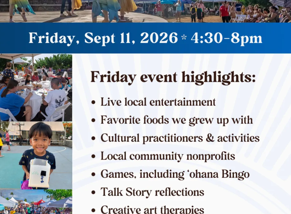 On Friday, September 11, from 4:30–8:00 pm at Maria Lanakila Catholic Church, Our Lahaina Story invites the community to gather around shared roots and living memories through local entertainment, favorite foods we grew up with, cultural practitioners and activities, creative art experiences, games, and talk story reflections. At the center of the evening is an interactive exhibit that honors the everyday moments, voices, and memories that continue to shape Lahaina.