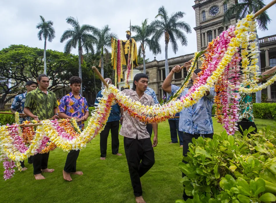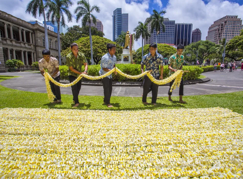 The second statue proudly stands in front of Aliʻiōlani Hale, home to Hawaiʻi's Supreme Court and the King Kamehameha V Judiciary History Center. All are welcome to join the regal women of ʻAhahui Kaʻahumanu in stringing 30-foot plumeria lei to serve as a base of lei on the statue - a tradition that has been carried on by these gracious ladies for nearly as long as the statue has stood. Donation of loose plumeria flowers accepted at 8 am. Supported provided by Hawaiʻi Tourism Authority and State Foundation on Culture and the Arts.